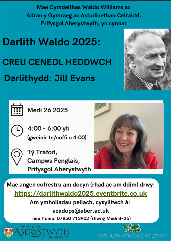 - Cofio Waldo – ‘Creu Cenedl Heddwch’Yr heddychwraig a chyn-aelod o Senedd Ewrop yn enw Plaid Cymru, Jill Evans o’r Rhondda fydd yn traddodi Darlith Waldo…