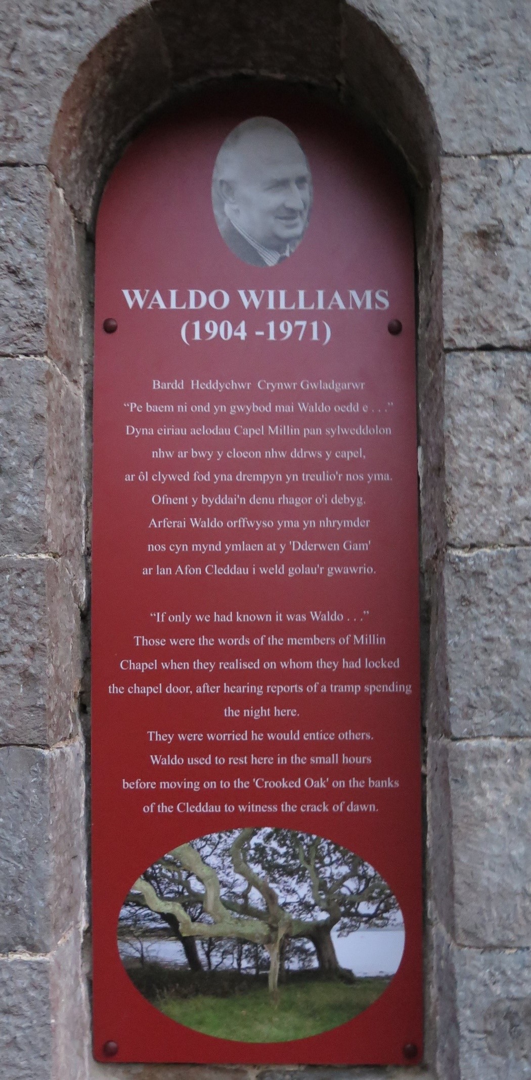 Dadorchuddiwyd plac coch gan Cerwyn Davies ar ran Cymdeithas Waldo yn un o ffenestri allanol y capel Methodistaidd i ddynodi cysylltiad yr heddychwr â’r fangre. Llywiwyd y noson gan y Parch Eirian Wyn Lewis, cadeirydd Cymdeithas Waldo a darllenwyd y cerddi ‘Cwm Berllan’ a’r ‘Dderwen Gam’ gan ei nai, Teifryn Williams.
