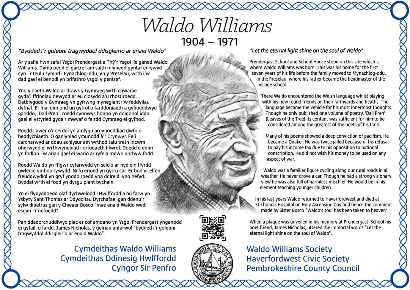 Yna ar Fedi’r 30 sef diwrnod geni Waldo dadorchuddir cofeb iddo yn yr Archifdy yn Hwlffordd. Ar safle’r Archifdy y safai Tý’r Ysgol, Ysgol Prendergast, lle’r oedd ei dad yn brifathro a lle treuliodd Waldo saith mlynedd cyntaf ei fywyd cyn i’r teulu symud i Fynachlog-ddu. Roedd yn blentyn uniaith Saesneg yn Hwlffordd ond cofleidiodd y Gymraeg ar ôl cyrraedd y Preselau trwy chwarae gyda’i gyfeillion newydd megis Edgar Tycwta a Dai Glynsaithmaen. Dadorchuddir y plac gan ei neiaint. Bydd y dadorchuddio yn digwydd am 5.30pm
